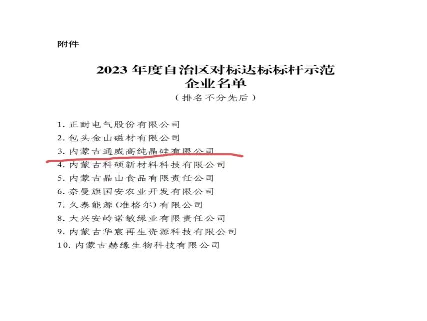 近日,内蒙古自治区市场监督管理局发布了2023年对标达标标杆示范企业名单,昆区企业内蒙古通威高纯晶硅有限公司榜上有名,获评自治区2023年对标达标标杆示范企业。这是昆都仑区市场监督管理局推进标准化战略、创建国家级硅产业标准化试点项目示范区取得的重要成果。