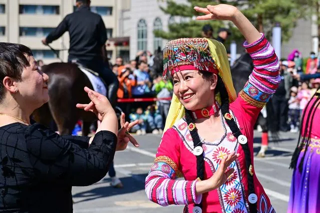 ▲在新疆乌鲁木齐市举行的巡游活动上,市民和游客一起跳麦西来甫。(图片来源:新华社记者 丁磊 摄)