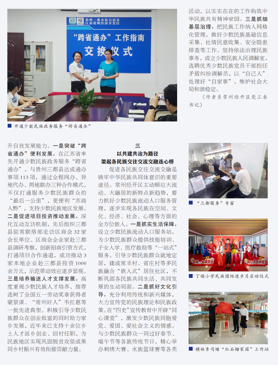 常州经开区现有常住少数民族36个,少数民族人口2.2万人,其中水族人口1.2万人,占在常水族人口的90%以上。近年来,我区深入贯彻落实习近平总书记关于加强和改进民族工作的重要思想,坚持以铸牢中华民族共同体意识为主线,努力推动民族工作高质量发展,动员各族群众为我区争创“国家级”、勇当“先行军”献计出力,促进各民族共同团结奋斗、共同繁荣发展。 一、以稳岗就业为依托,铺就各族群众脱贫致富路。 就业是最大的民生。为此,我们始终把稳岗就业作为重中之重来抓,全力实施促进就业富民工程,推动各族群众一道过上高水平小康生活。一是推介岗位“送好饭碗”。与少数民族地区签署劳务协作协议,建立长期劳务合作机制,定期组织本地企业到少数民族地区开展专场招聘,先后招收8000余名少数民族群众进入辖区内企业就业务工。二是扶持创业“造好饭碗”。以培育少数民族特色优势产业项目为突破口,实施“家门口”创业工程,打造常丰村水族马尾绣创业基地,先后聘用水族绣娘百余人次,让水族群众在他乡“绣”出幸福生活。完善少数民族创业项目扶持政策,助力“沙裕昌”等少数民族企业在质量管理、品牌推介、非遗申报等方面提档升级、焕发新生。三是优化服务“端好饭碗”。充分发挥“红石榴家园”的服务功能和辐射效应,常年为少数民族务工人员提供职业介绍和就业指导。协调签署常州——三都水族自治县法律服务合作协议,专设法律援助工作站为驻常水族群众调解纠纷。在2021年贵州省脱贫攻坚工作总结中,特别提及我区帮助水族困难群众在异地稳定就业作出的积极贡献。 二、以创新服务为抓手,打好促进共同繁荣发展主动仗。 发展是解决民族地区各种问题的总钥匙。为此,我们坚持把帮助民族地区破解乡村振兴的难点、堵点作为做好民族工作的切入点和发力点,助推民族地区提升自我发展能力。一是突破“跨省通办”便利发展。在全省率先开通少数民族政务服务“跨省通办”,与贵州三都县达成通办事项113项,通过全程网办、异地代办、两地联办三种合作模式,不仅打通服务少数民族群众的“最后一公里”,更便利“苏商入黔”,支持少数民族地区发展。二是促进项目投资推动发展。深化互动互访机制,先后组织三都县驻常联络部走访区商会32家会长单位、区商会企业家赴三都县调研考察,创新招商引资方式,打通项目合作通道,成功推动3家本地企业赴三都县投资1000余万元,示范带动效应逐步显现。三是培养输送人才支撑发展。高度重视少数民族人才培养,推荐选树了全国五一劳动奖章获得者蒙景谋、“常州好人”韦红惠等一批先进典型。积极引导少数民族群众在创业致富的同时助力家乡发展,近年来已支持十余位乡土人才返乡创业、回村任职,为民族地区实现巩固脱贫攻坚成果同乡村振兴有效衔接贡献力量。 三、以共建共治为路径,架起各民族交往交流交融连心桥。 促进各民族交往交流交融是铸牢中华民族共同体意识的重要途径。为此,我们主动顺应大流动、大融居的新特点新趋势,着力抓好少数民族流动人口服务管理,逐步实现各民族在空间、文化、经济、社会、心理等方面的全方位嵌入。一是抓实生活保障。设立少数民族流动人口服务站,为少数民族群众提供技能培训、子女入学、医疗救助等“一站式”服务。引导少数民族群众就地定居,建成常丰村、省庄村等多民族融合“嵌入式”居住社区,不断巩固各民族共同生活、共同发展的生动局面。二是抓好文化引导。充分利用传统和新兴媒体,大力宣传党的民族理论和民族政策。在“四史”宣传教育中开辟“同心课堂”,激发少数民族同胞爱党、爱国、爱社会主义的情感。与少数民族群众一同过好春节、端节等各族传统节日,精心举办刺绣大赛、水族篮球赛等各类活动,以实实在在的工作筑牢中华民族共有精神家园。三是抓细基层治理。把民族工作纳入网格化管理,做好少数民族基础信息采集、社情民意收集、安全隐患排查等工作。坚持依法治理民族事务,成立少数民族人民调解室,选聘优秀少数民族党员干部担任矛盾纠纷调解员,以“自己人”处理好“自家事”,维护社会大局和谐稳定。 |