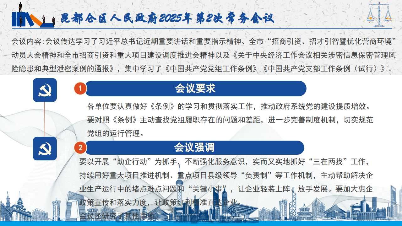 会议指出,各单位各部门要深入学习领会近期习近平总书记重要讲话和重要指示精神,立足我区实际,找准找实贯彻落实的切入点着力点。要以开展“助企行动”为抓手,不断强化服务意识,实而又实地抓好“三在两找”工作,持续用好重大项目推进机制、重点项目县级领导“负责制”等工作机制,主动帮助解决企业生产运行中的堵点难点问题和“关键小事”,让企业轻装上阵、放手发展。要加大惠企政策宣传和落实力度,让政策红利精准直达企业。各单位要认真做好《条例》的学习和贯彻落实工作,推动政府系统党的建设提质增效。要对照《条例》主动查找党组履职存在的问题和差距,进一步完善制度机制,切实规范党组的运行管理。