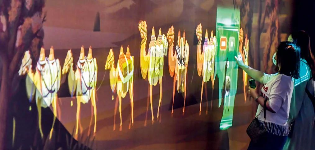 2022年5月,新疆博物馆二期场馆全新大展“中央王朝统辖治理新疆主题系列展览”。图为参观者现场体验“唐代丝绸之路”体感互动游戏。(中新社发 刘新 摄)